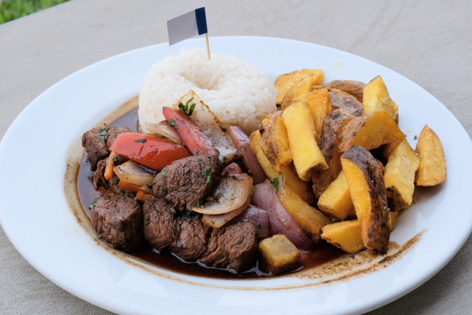 ワイナリー内のレストランメニューには、ペルーの名物料理が並びます。牛肉の細切り、タマネギ、トマトを炒めて醤油で味付けした「ロモ・サルタード」、豆を混ぜ込んだご飯をフライパンで大きなオムレツのように焼き上げた「タクタク」などは、日本人の舌にも合う味わいでした。