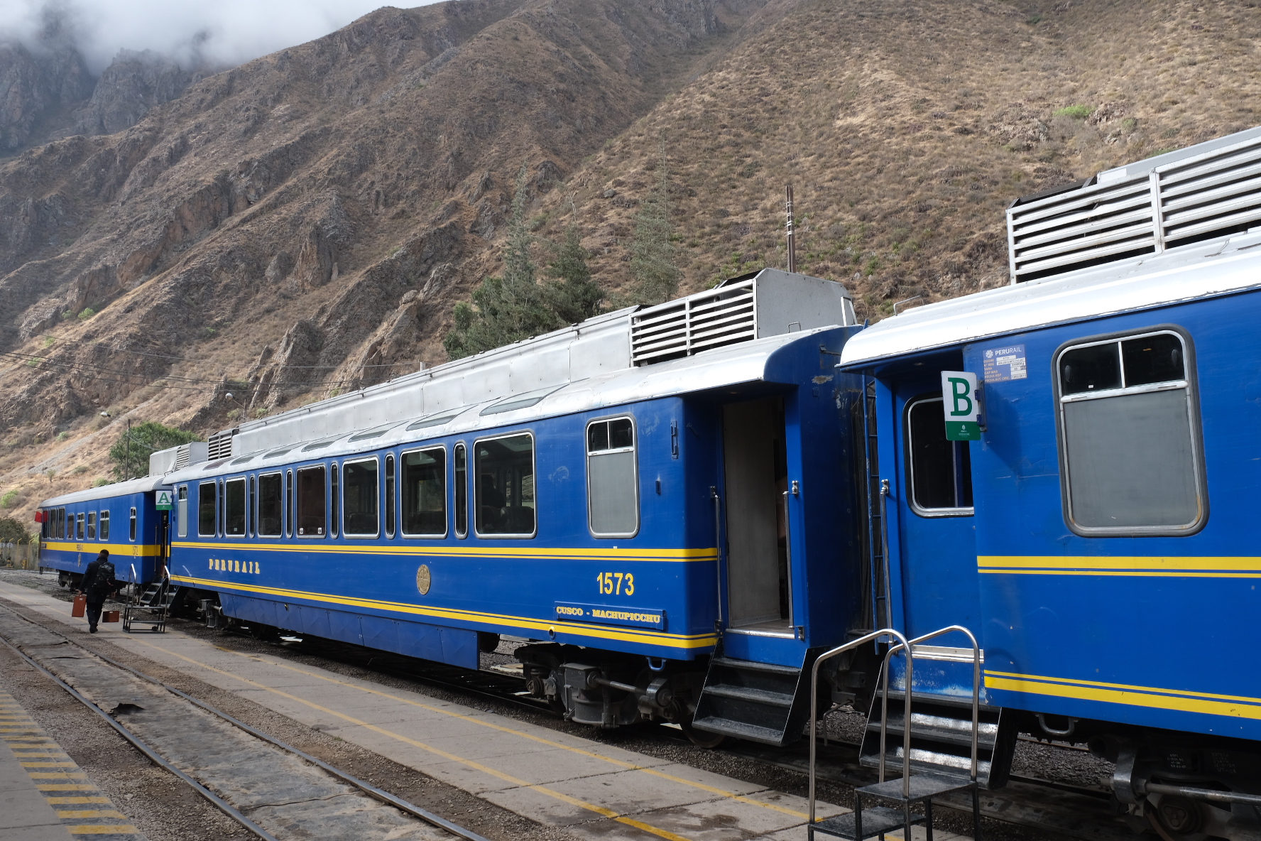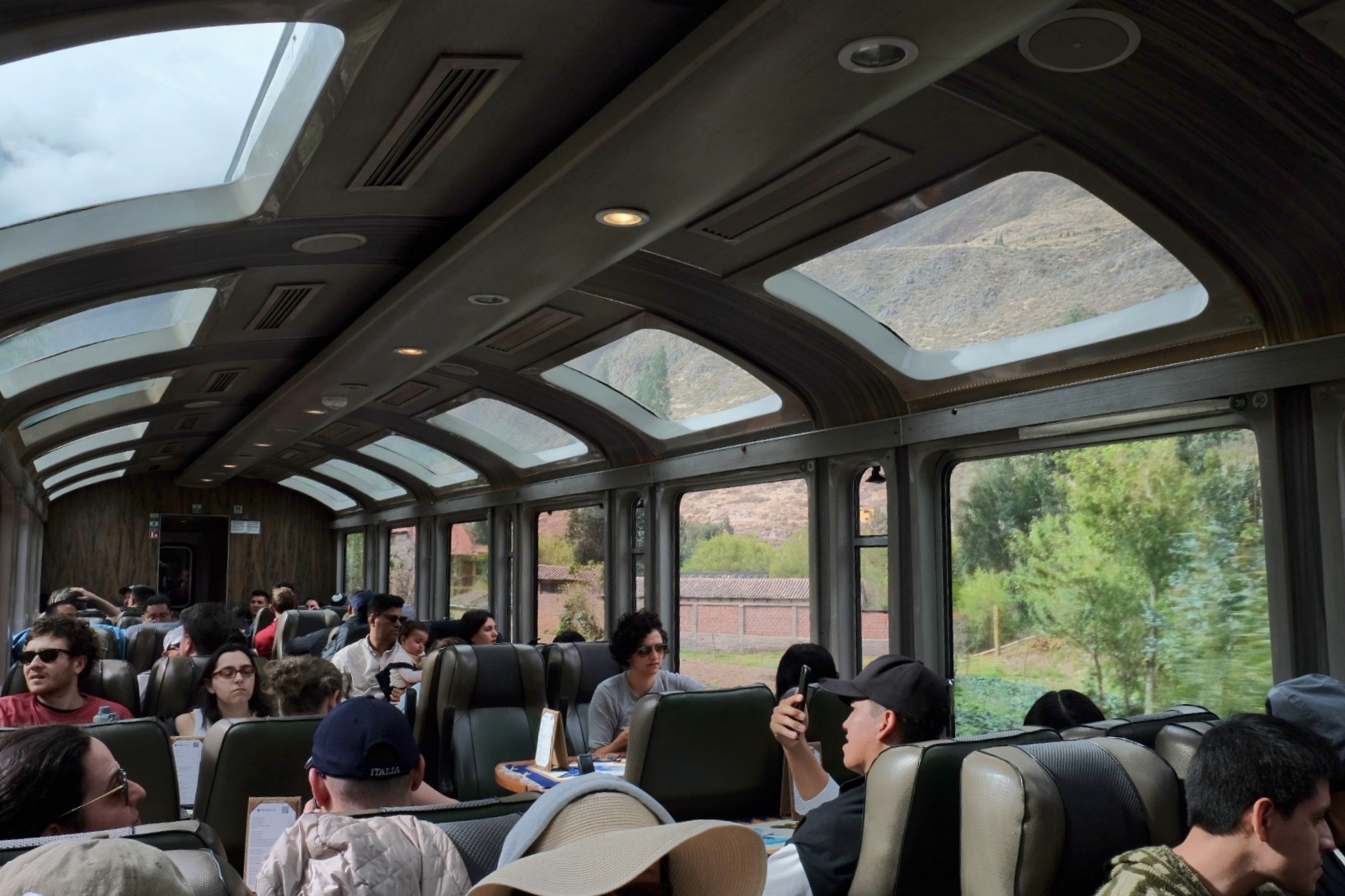 まず、クスコから車で約2時間かけてオリャンタイタンボ駅へ向かい、列車に乗り換えます。今回は、天井まで窓が広がる観光列車「ビスタドーム」に乗ってみました。