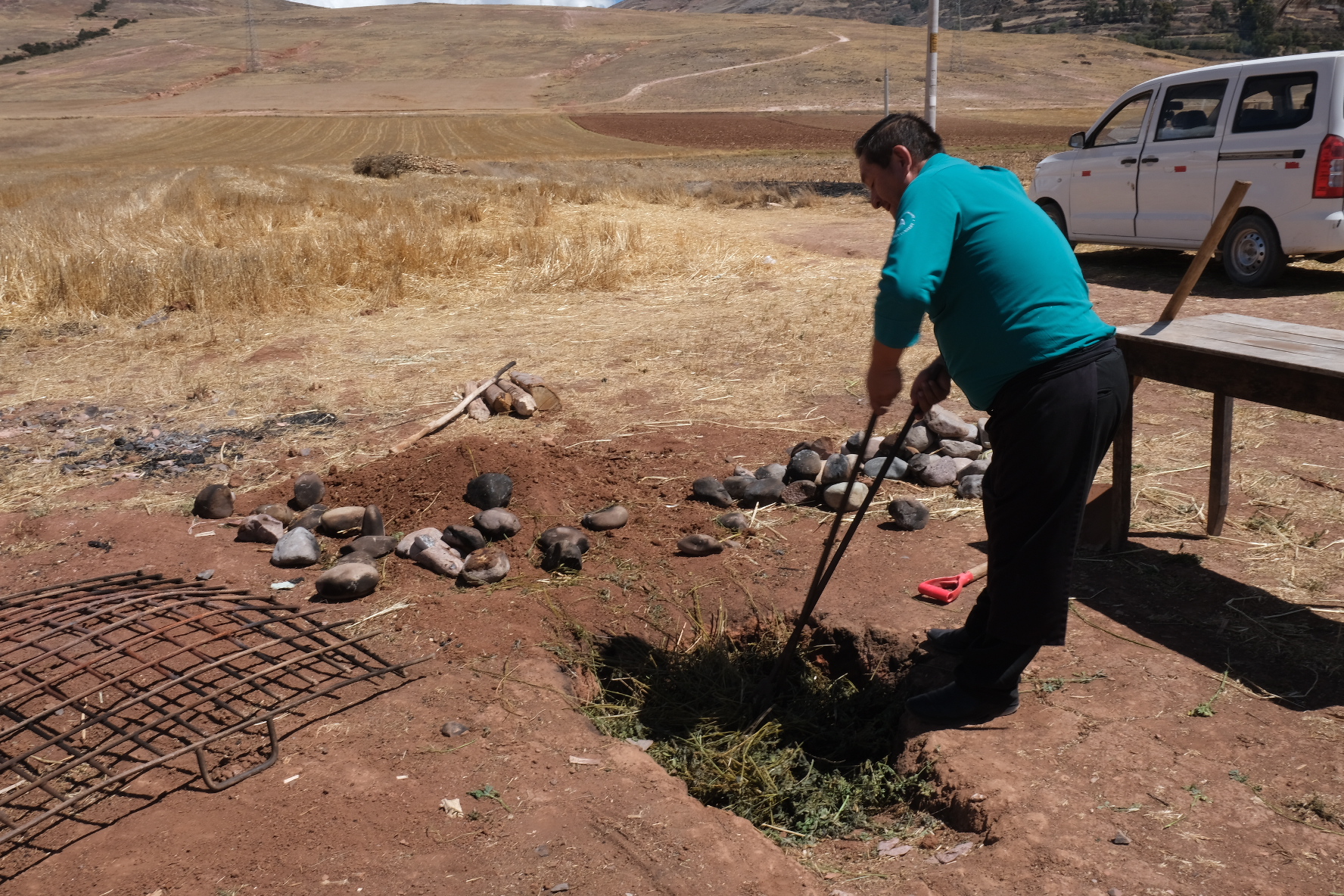 この日の昼食は、レストラン「ウヌ」でペルーの伝統料理「パチャマンカ」を体験しました。パチャマンカは、インカの言葉で「大地の鍋」を意味し、焼いた石を敷き詰めた地面の中に、ハーブなどでマリネした肉や野菜、ジャガイモなどを入れて蒸し焼きにする豪快な料理です。