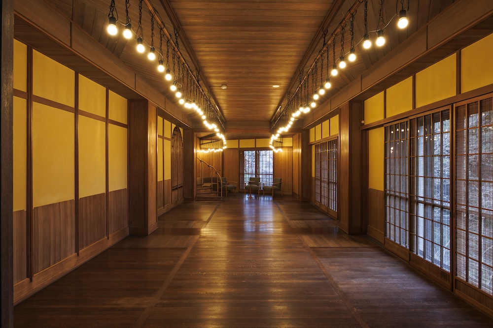 熱海にある名建築でぜひ訪れたいのはこちら。実業家の別邸として1936年に竣工。木造の母屋は、銀座の和光や上野の東京国立博物館を設計した渡辺 仁が、地下室はドイツの建築家ブルーノ・タウトが手掛けた。竹や桐を使った社交室、洋風客間と日本間、ベランダで構成され、古い建物でありながら、空間づくりや照明などの随所にモダンな洋のエッセンスを感じられる。