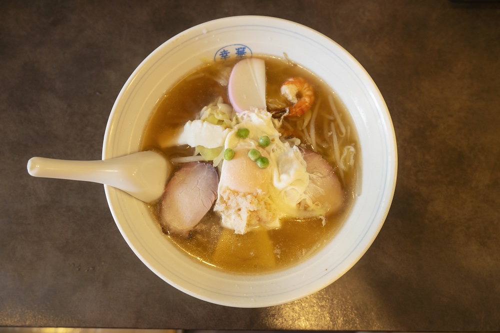 かつて花街文化が栄えた熱海。お座敷の合間に出前を取る店も多かったそうだが、そんな時代から愛され続けているのがここ。1950年の熱海大火で一度は焼失するも同じ場所で営業を続け、文豪・坂口安吾も通ったという名店だ。名物は卵まるごと1個と、野菜、チャーシュー、イカ、カニフレーク、かまぼこなど具材たっぷりの五目そば(1,300円)。町中華=庶民の味という印象だが、戦後は卵が高級品だったため、この五目そばはかなり贅沢な一品として愛されていたそう。料理はボリューミーながら味つけはやや甘めでさっぱりしているので、どんどん箸がすすむ!