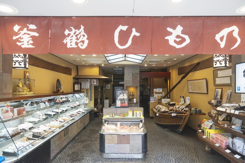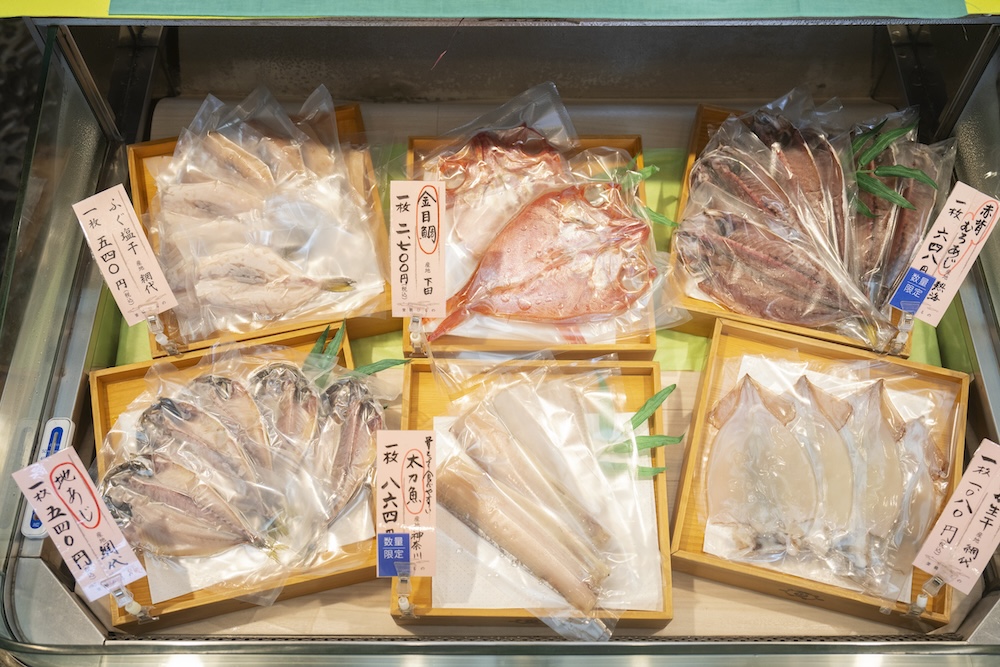 熱海では駿河湾や相模湾など近海で獲れた魚を日持ちさせるための干物文化が盛ん。ここは創業160年の老舗で、名物のアジなど常時約30種の干物を扱う。買いつけから加工まで一貫して自社でおこなうのがこだわり。塩加減は控えめにして、素材の味を引き立てている。最近は有機オリーブオイルを使ったアンチョビ(972円)が お土産に人気。