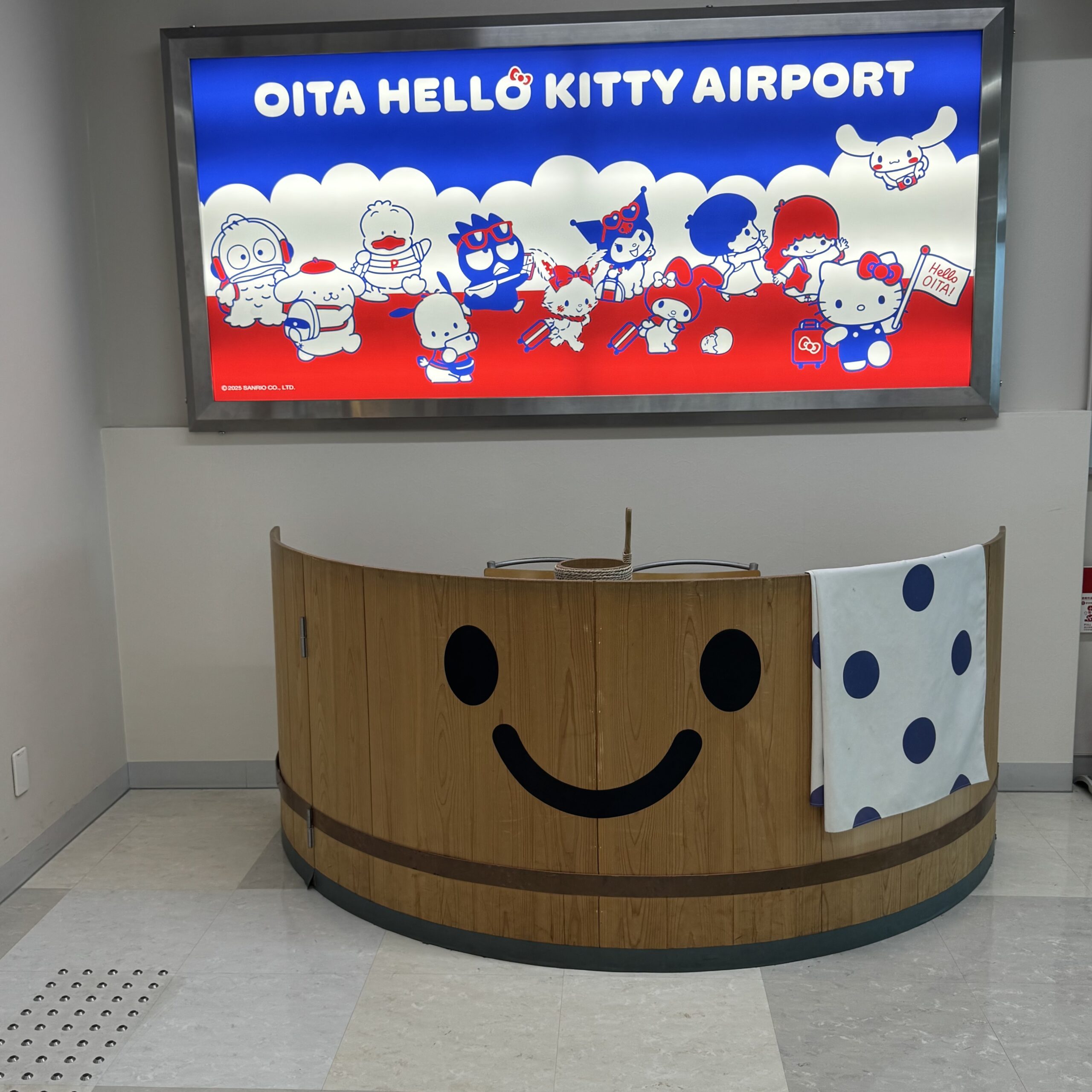 東京から大分への一番早いアクセスは飛行機。大分空港に降り立つと、なんとキティちゃんがお出迎え!「大分ハローキティ空港」になっていました。