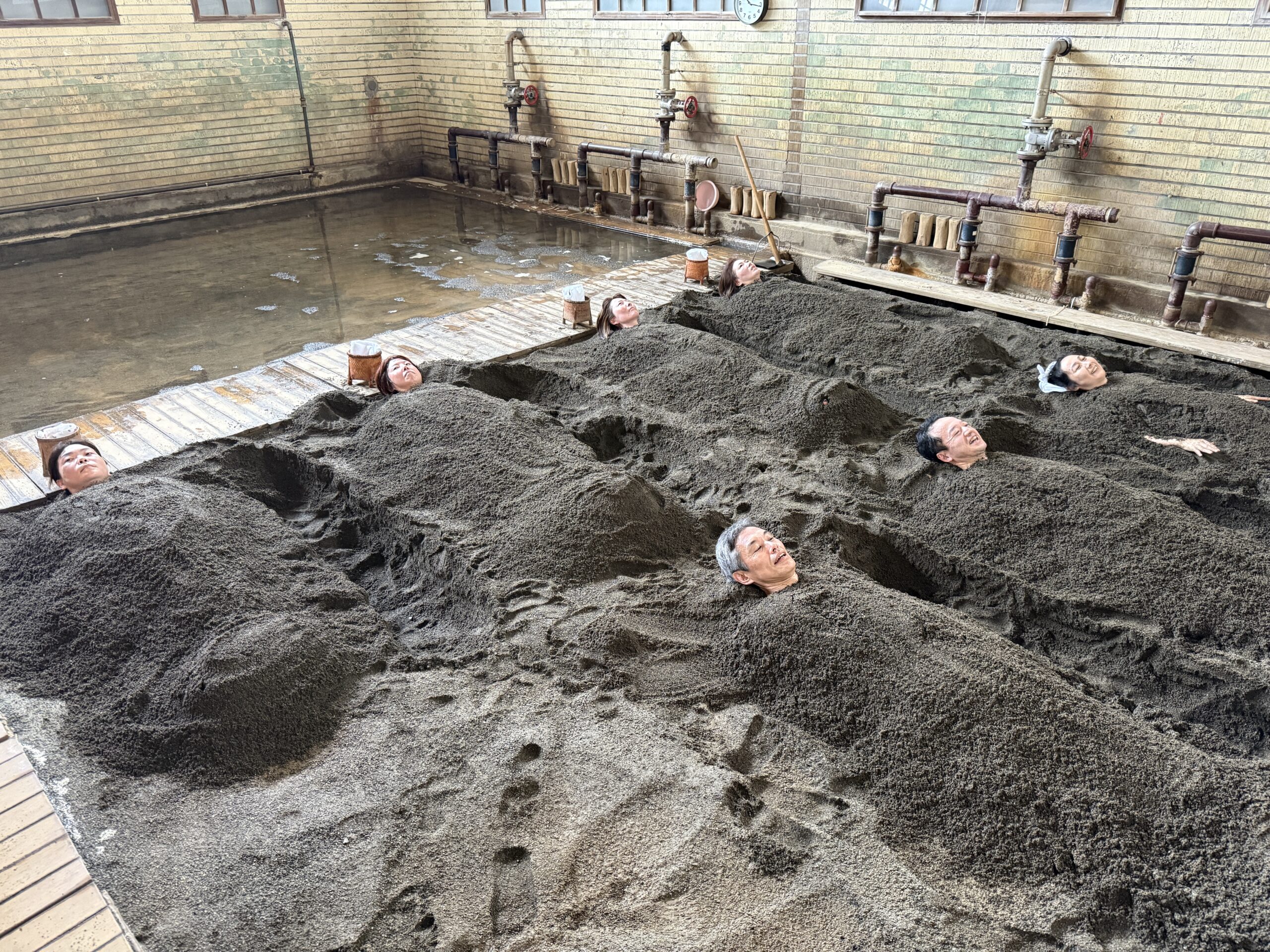専用の浴衣を着て、砂の上に横たわると、砂かけスタッフさんが温泉で温まった砂をどんどんかけてくれます。だんだんずっしり重みがかかり、砂のじんわりした熱が体に伝わってきて、汗が噴出してきます。15分も入れば汗だく。砂湯から上がった後は、シャワーを浴びて汗と砂を落とします。独特の砂の熱で体の芯まで温まり、日頃の疲れが取れてスッキリした感じがしました。