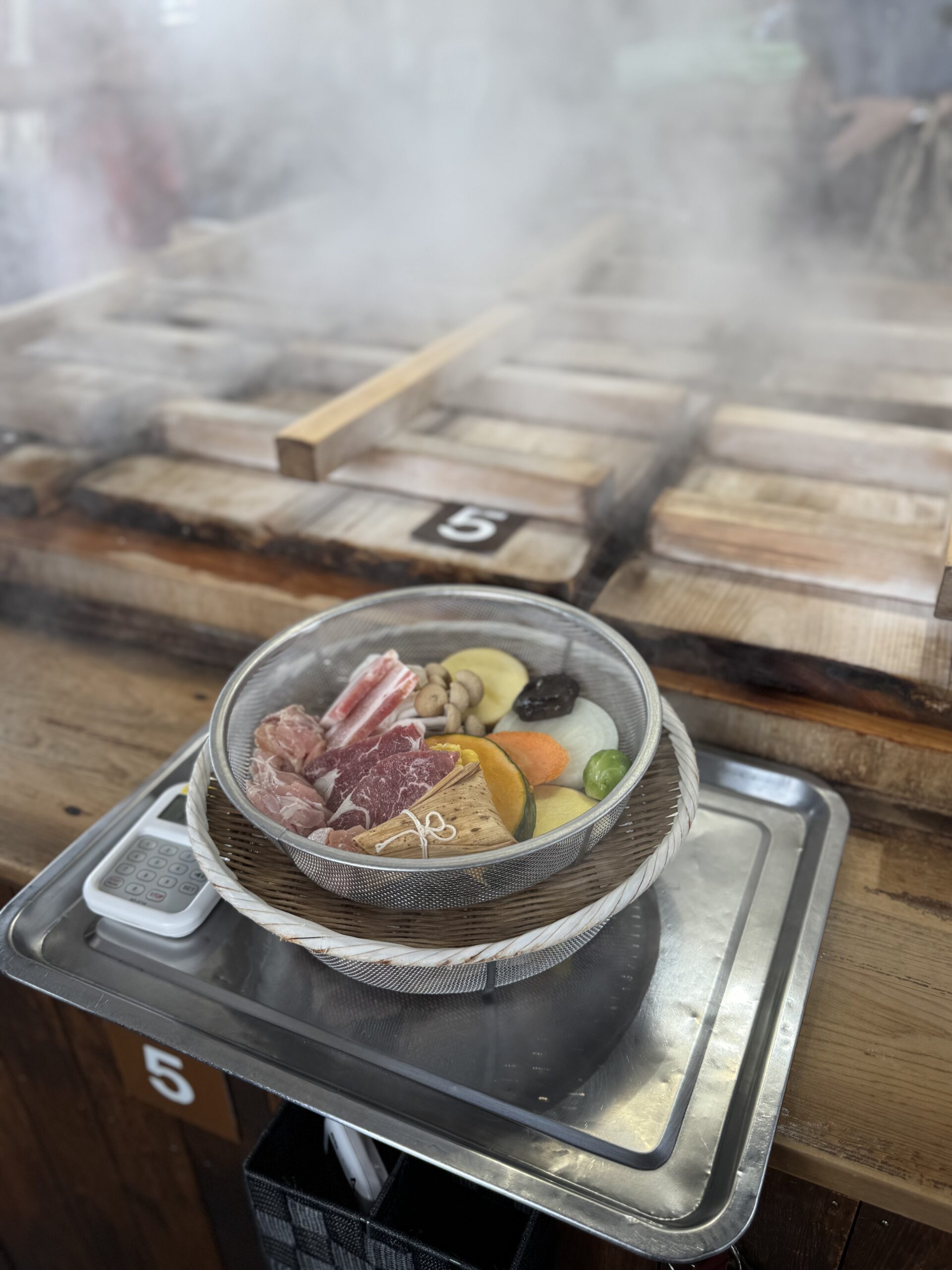 おすすめとのことで、「別府温泉ぶたまん」も蒸してみました。温泉で蒸すという非常にシンプルな調理法なのに、なぜこんなにも美味しいのでしょう。カゴいっぱいに入っていた肉や野菜をあっという間にペロリ。テーブルにはポン酢、塩、そして頼めばさまざまな調味料が用意されていますが、まずは塩で食べるのが最高に美味しかったです!