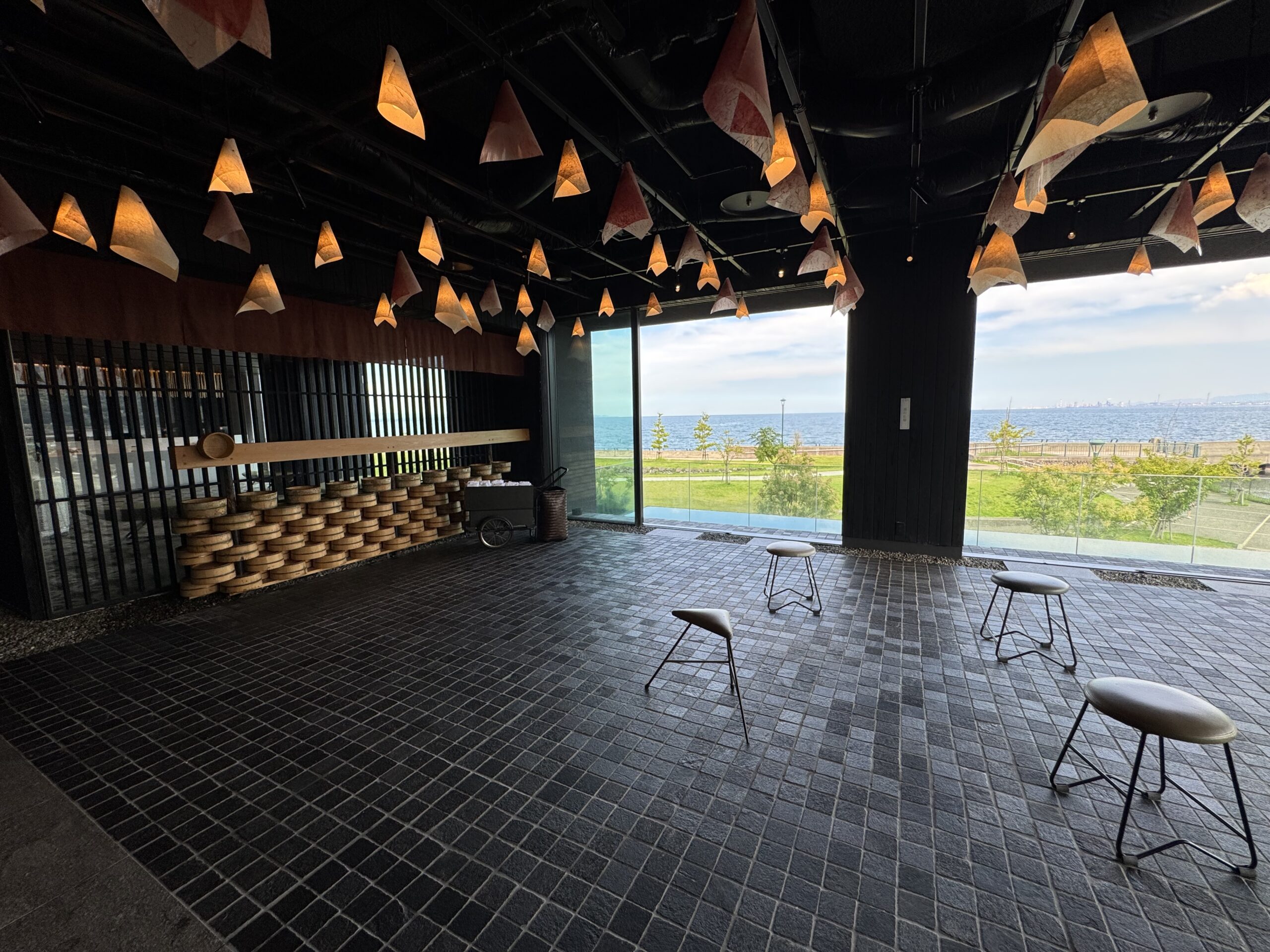 今回泊まったのは、別府湾を眼下に見下ろす宿泊施設「界 別府」です。建物の設計はなんと建築家の隈 研吾さん。入口からエレベーターを上がり、扉が開くと目の前にはいきなりバーンと広がる青い海と空。天井からは和紙の灯りが優しく瞬き、湯桶をずらりと並べたオブジェから温泉がホカホカと滴る、印象的なスペース「湯の広場」が登場します。海を見下ろす位置には足湯もあり、抜群の眺めです。