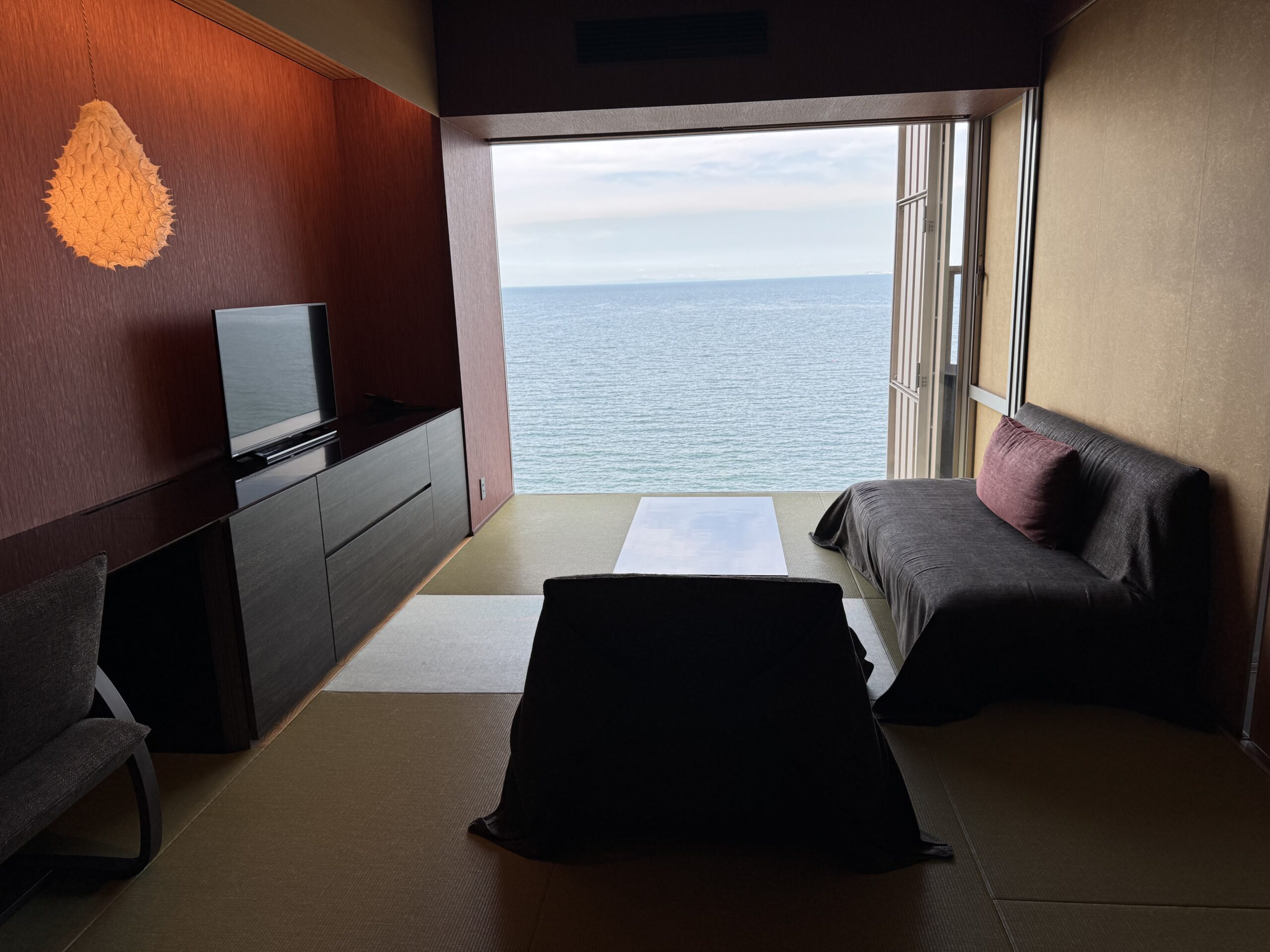 客室はすべてオーシャンビュー。別府湾に面した、1枚の絵のような全面ガラスのピクチャーウィンドウです。時間によって刻々と変わっていく風景をただ眺めているだけでも楽しい。頑張って早起きすると、朝日が昇る絶景を満喫することができます。客室の温泉露天風呂も同じ方向に面しているので、海を眺めながらの入浴が楽しめます。