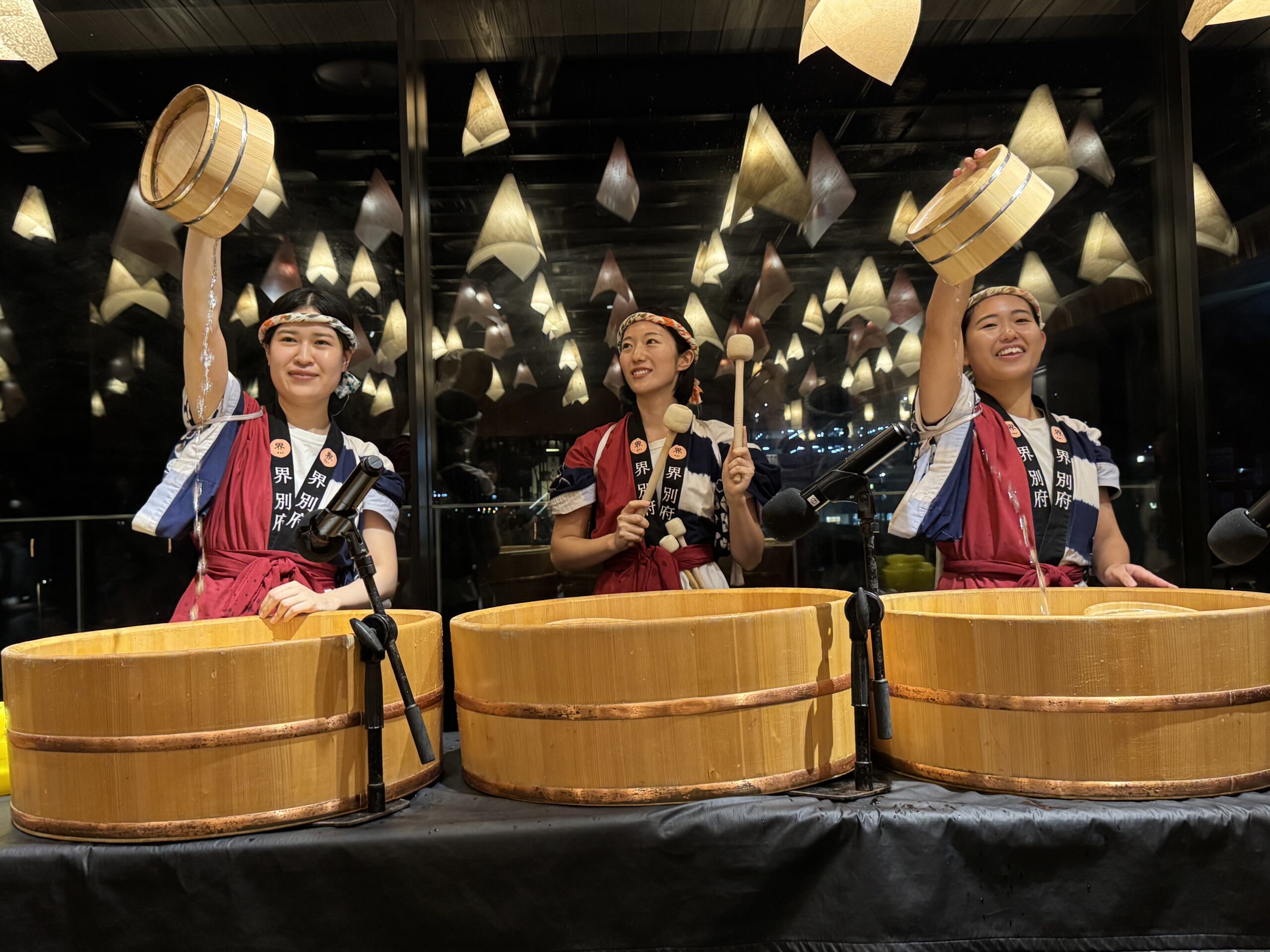 夕食には大分の素材をふんだんに使った「豊後鍋とりゅうきゅうの会席」を楽しみました。そしてそれだけでは終わりません。ここのコンセプトは「ドラマティック温泉街」。別府の街は夜の飲み歩き、食べ歩きが楽しい街でもあり、その雰囲気を演出する、楽しい催しが多々。