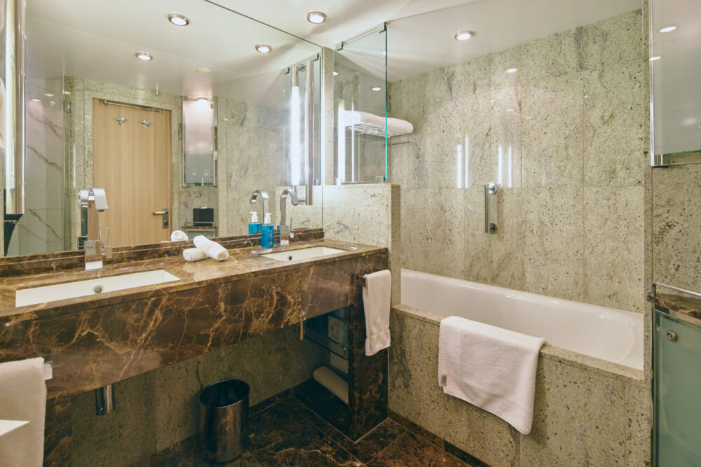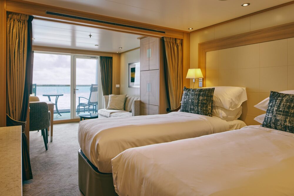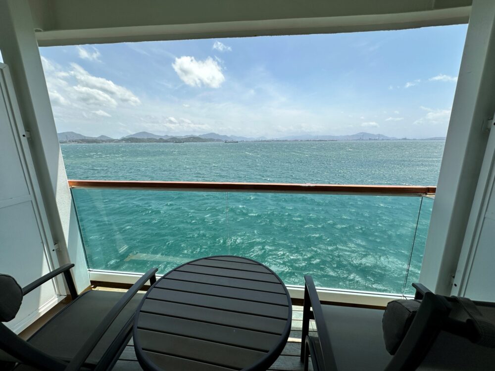 今回、おじゃました「ベランダスイート」は、ツインベッドにソファもダイニングテーブルもある船内とは思えない広いお部屋で、さらにミニバー、ウォークインクローゼットつき! 落ち着いたインテリアでくつろげ、ベランダに出れば絶景に癒やされ……。