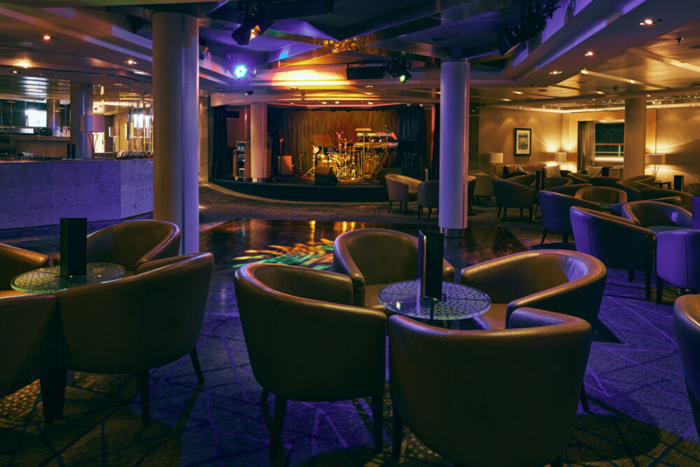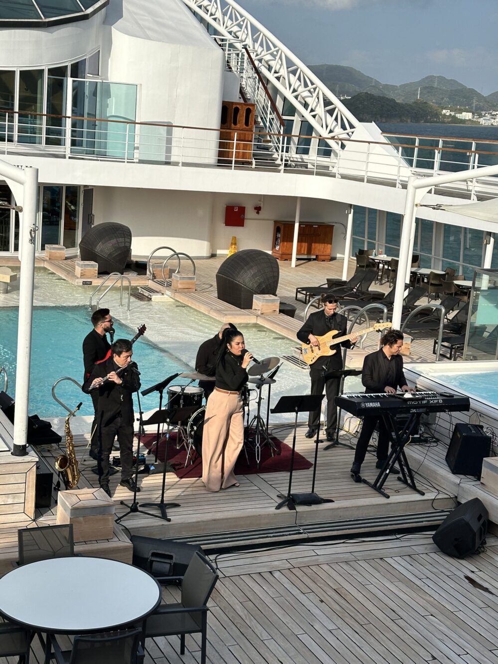プールサイドのステージでは出港時のパーティなど、時間やシチュエーションにあわせてライブがおこなわれるので、お酒を飲みながら盛り上がるのも楽しい!