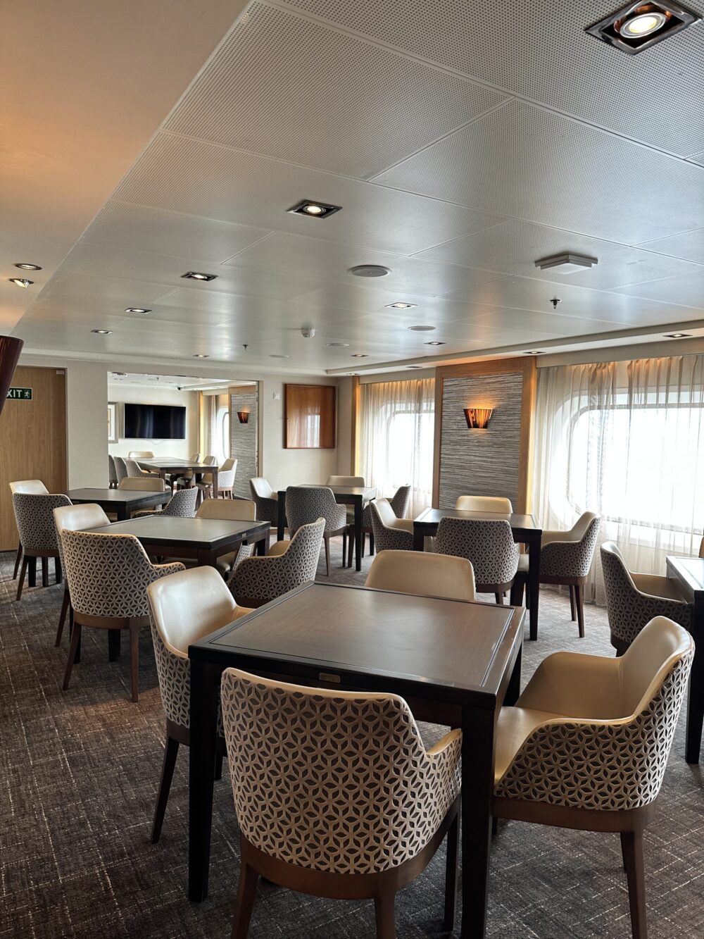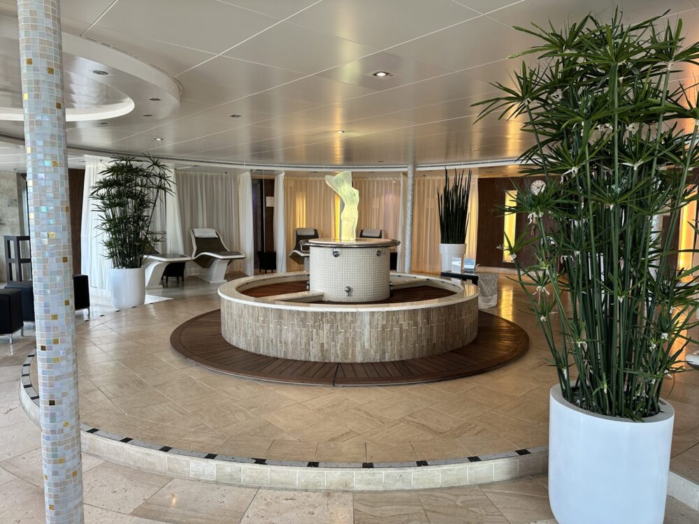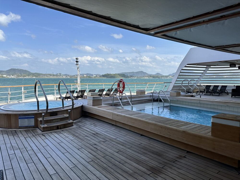 クルーズといえば、目的地へ向けて移動しながらもゆったり過ごせるのが魅力ですが、このプールサイドはまさに最適。通年適温のプールに浸かってリラックスしたり、チェアで風を感じながら昼寝をしたり……。
