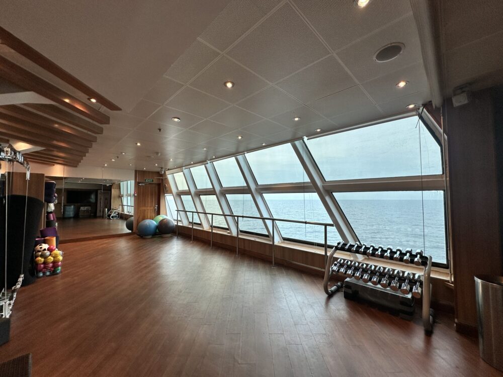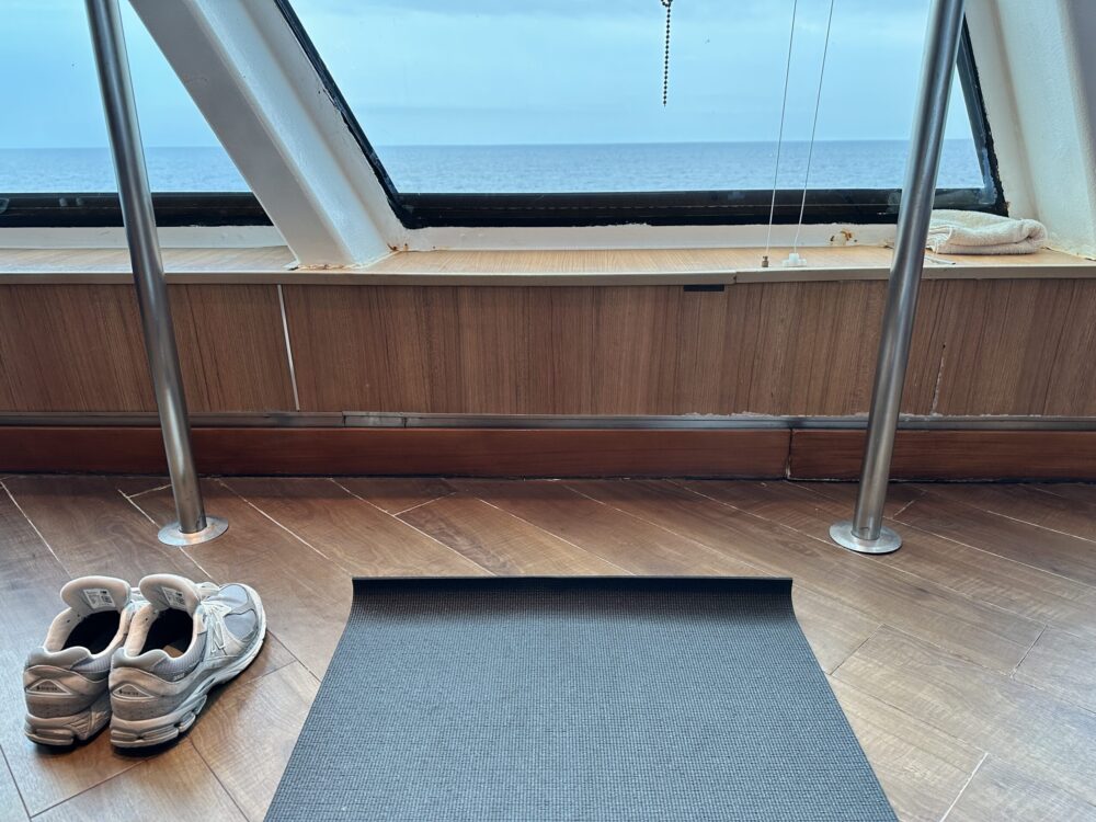 船内新聞をチェックして、参加してみたのは、朝7時からモーションスタジオでおこなわれていたサンライズストレッチ。大きな窓際にヨガマットを広げて寝転んで、トレーナーの方に教わりながら体全体をしっかり伸ばすストレッチは、たいへん気持ちよかったです。