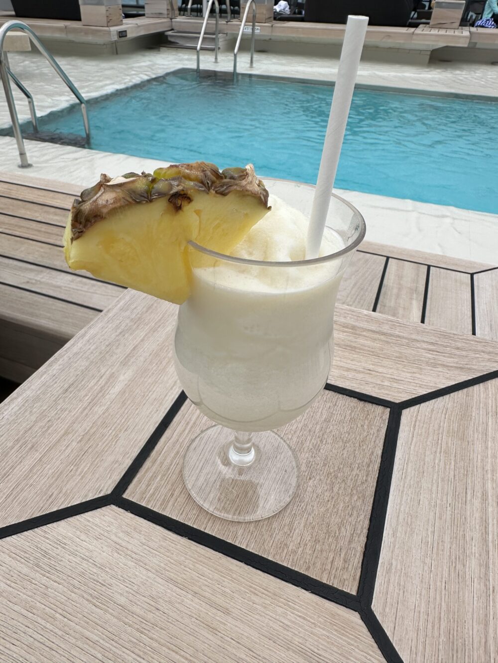 プールサイドにある「プールサイドレストラン&バー 湖畔」で、トロピカルなドリンクを頼むのもテッパン。クルーズは多くのサービスがインクルーシブで、基本的な食事代や施設利用料込みの代金になっているので、レストランやバーでオーダーしても支払いはなし(一部レストランやサービスは別料金)。好きなときに好きなものを食べたり飲んだりできるのも、クルーズの魅力のひとつ。