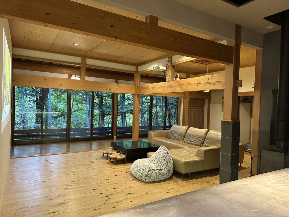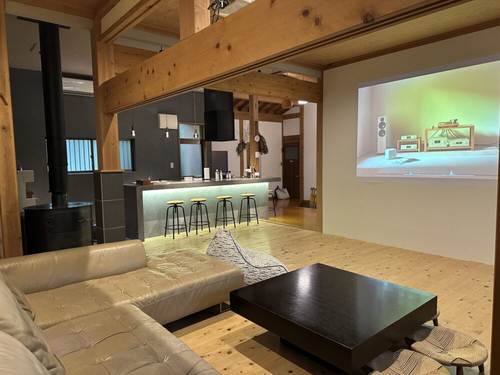 そしてこちらの宿、内装も素敵でした……。窓いっぱいに自然を望める広いリビングに、おしゃれで使いやすいダイニングキッチン。プロジェクターがあるのもポイント高い!