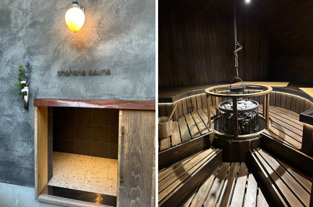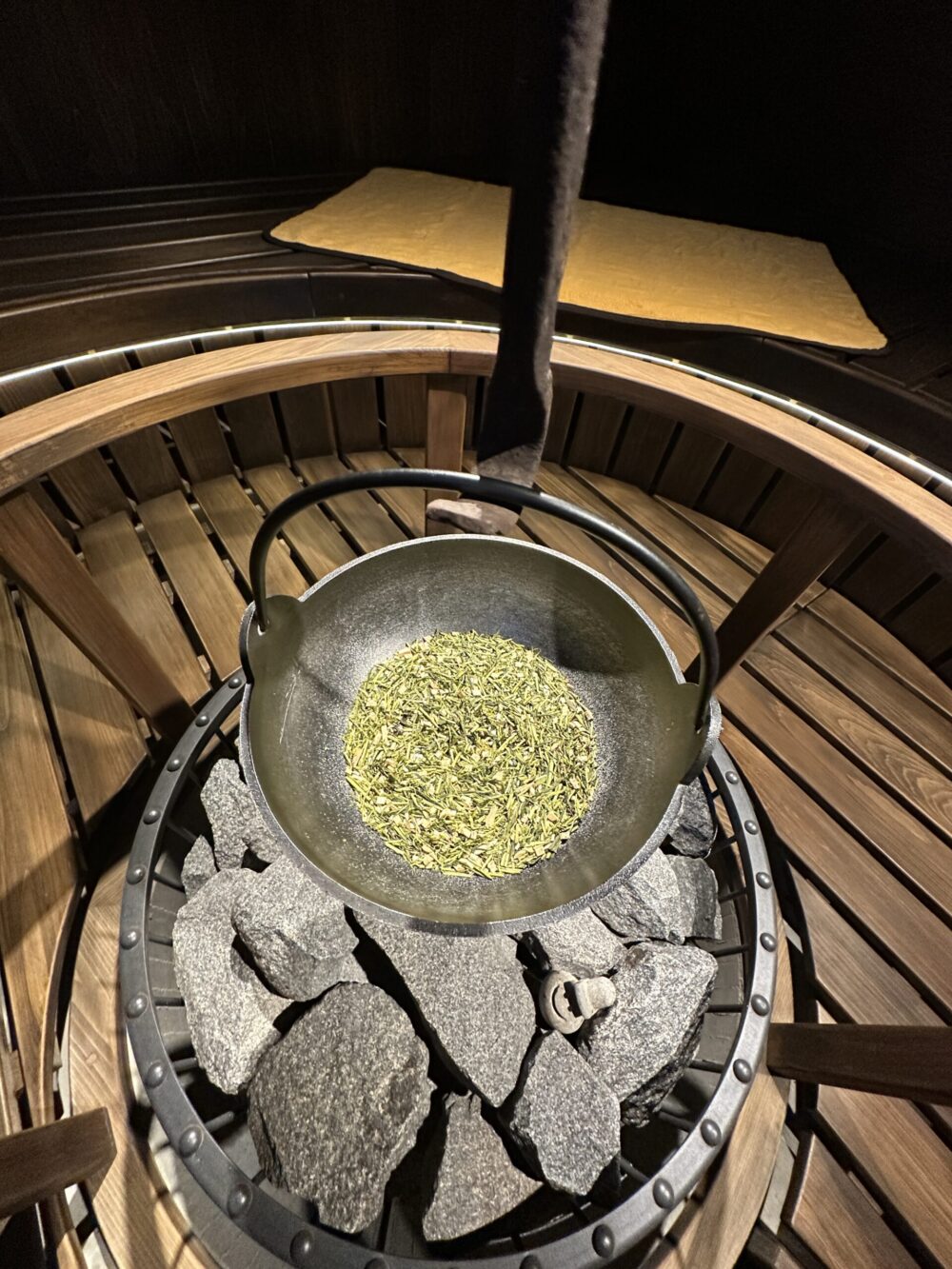 中庭から別館の小さなドアをくぐると、そこは立派なフィンランド式サウナ。サウナストーブの上には、お茶の葉とハーブが入れられた鉄鍋の茶香炉がセットされており、ロウリュをおこなうと優しいお茶の香りに包まれます。