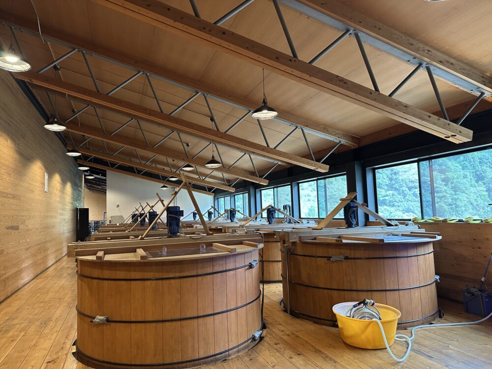 写真は麦汁を発酵させる発酵槽。このタンクも静岡産の杉でつくられています。林業が盛んな地域ならではの特色が、ウイスキーづくりにも生かされています。