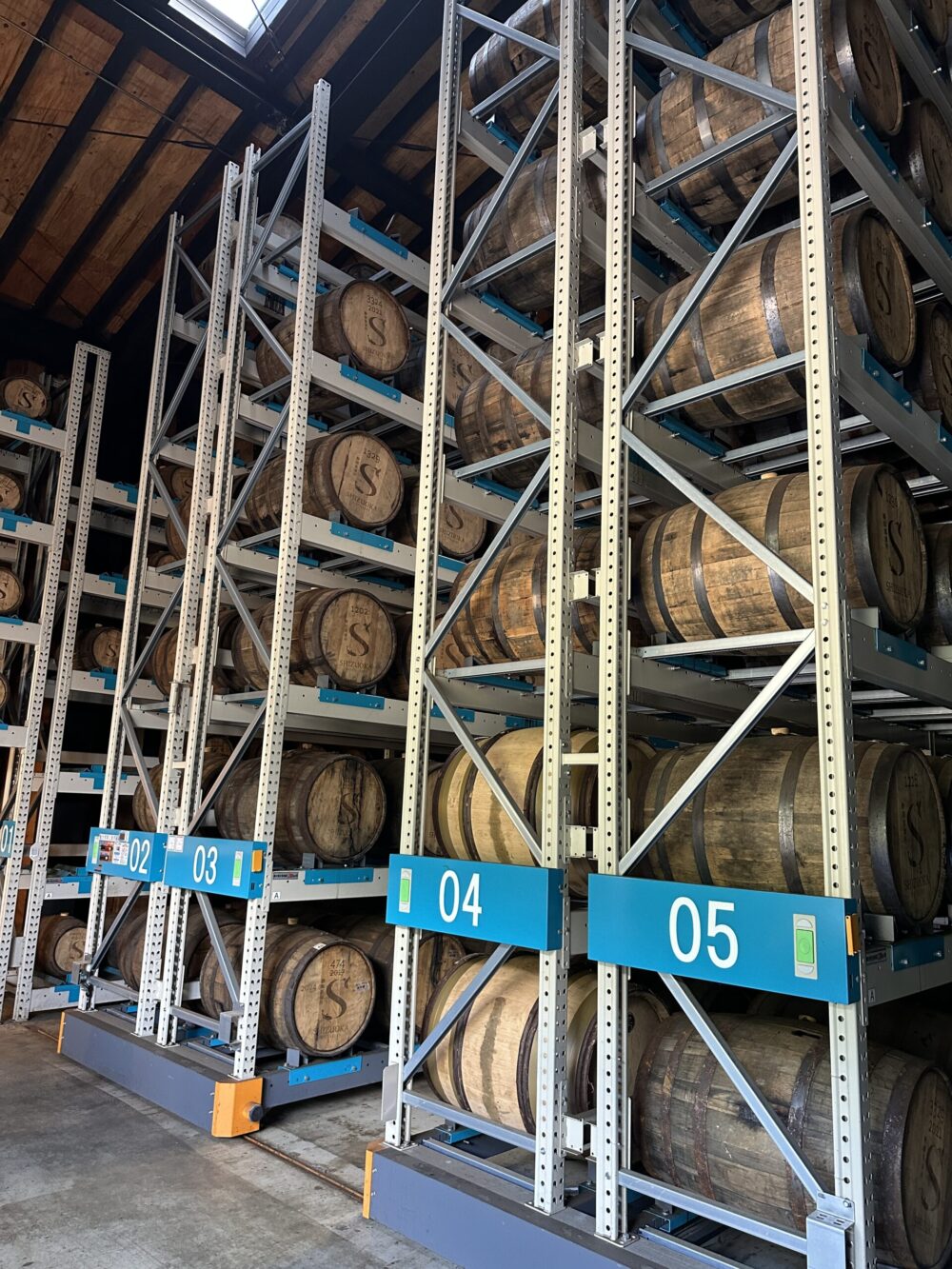 ウイスキーを寝かせる熟成庫は圧巻の光景! 樽がぎっちりと棚に並び、時を重ねていました。