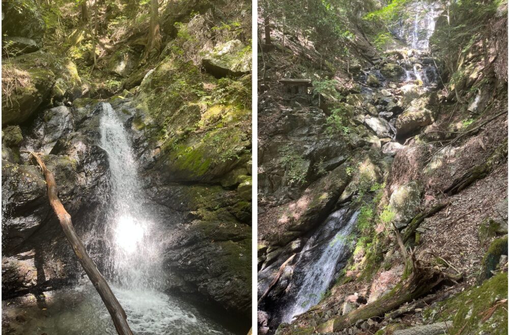 その水は、標高1,500メートル級の七ツ峰から流れ出た清流。滝の音と、森にこもる冷気が調和し、夏でもひんやりとした空気が漂います。